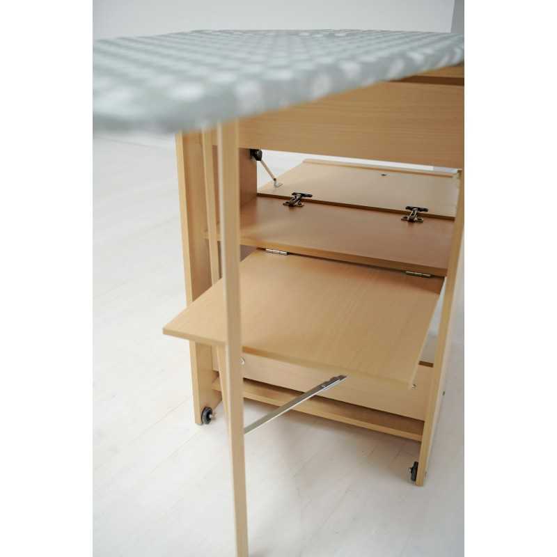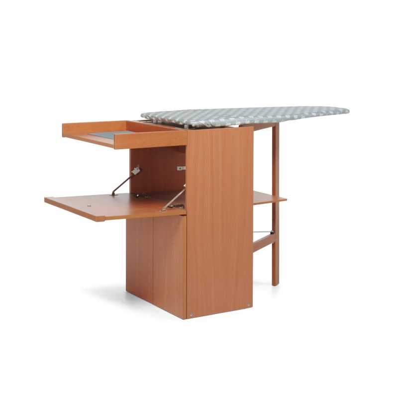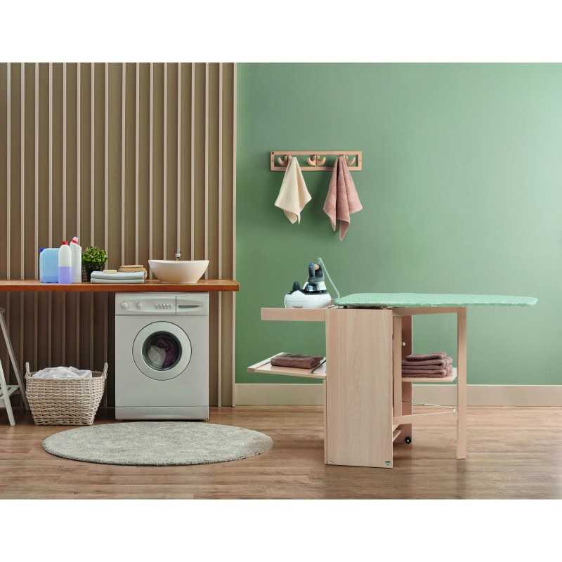 Realizzato con materiali di alta qualità, la struttura è in truciolare nobilitato, mentre il telaio di sostegno è in legno massiccio di faggio verniciato. Il piano da stiro è in multistrato di pioppo, dotato di fori traspiranti per evitare la condensa durante l'uso. Inoltre, il piano è rivestito con LaCopertina, un materiale resistente alle alte temperature, e ilMollettone in poliestere 100% per una protezione extra.