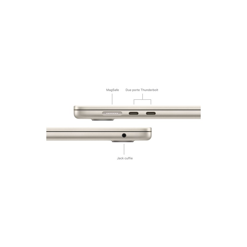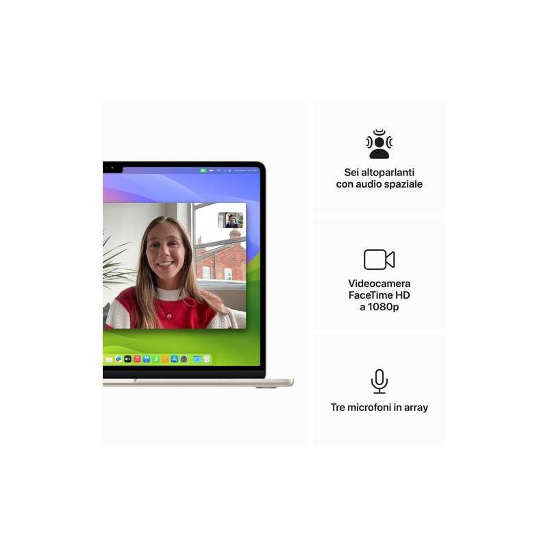 Dotato di Wi-Fi 6E e Bluetooth 5.3, questo MacBook Air garantisce connessioni veloci e stabili per tutte le tue esigenze online. Il sistema audio a sei altoparlanti con supporto per l'audio spaziale offre un'esperienza sonora immersiva, perfetta per videoconferenze, ascolto di musica o visione di film. La videocamera FaceTime HD a 1080p e il sistema a tre microfoni assicurano videochiamate di alta qualità, ideali per il lavoro da remoto o per mantenere i contatti con amici e familiari.